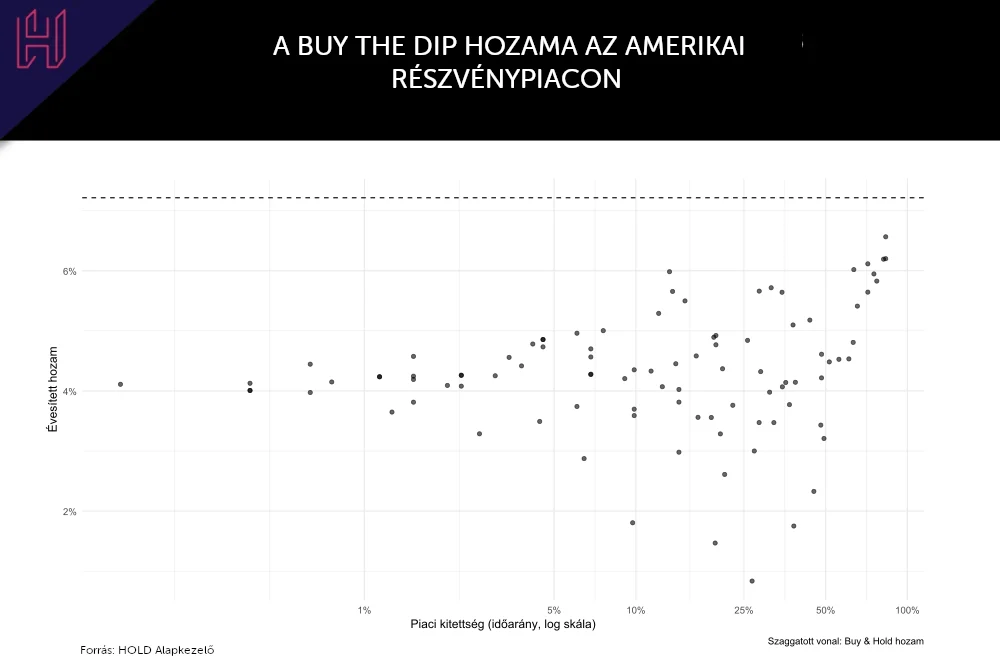 Az alábbi grafikonon láthatók a fenti stratégiák eredményei az 1960–2026 közötti időszakban. A grafikon minden egyes pontja egy-egy buy the dip stratégia évesített hozamát mutatja az x tengelyen ábrázolt piaci kitettség függvényében, vagyis annak arányában, hogy a teljes időszak hány százalékában volt a stratégia részvénypiaci pozícióban. A szaggatott vonal azt a hozamot jelöli, amelyet a piac folyamatos tartásával (Buy & Hold) érhettünk volna el.